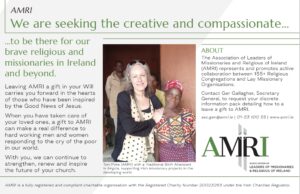 If you would like to find out more about AMRI or find out how to give to AMRI, request an information pack that will explain the next steps in leaving a gift to AMRI. Email Secretary General, Gerard Gallagher, sec.gen@amri.ie (Discretion assured).